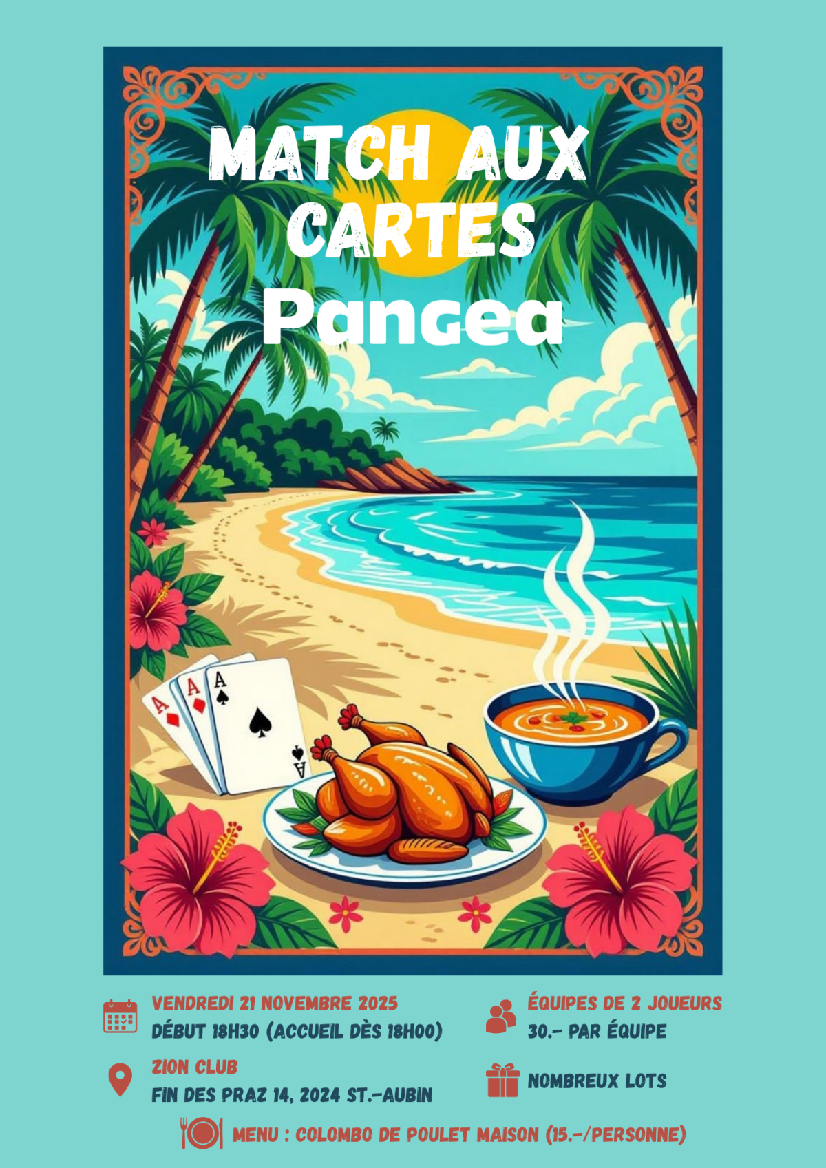 Rejoins-nous le vendredi 21 novembre 2025 au Zion bar pour une soirée qui s'annonce conviviale et savoureuse. En effet, ce match aux cartes sera placée sous le thème des Antilles car un Colombo de poulet maison vous sera proposée avant le début du tournoi.